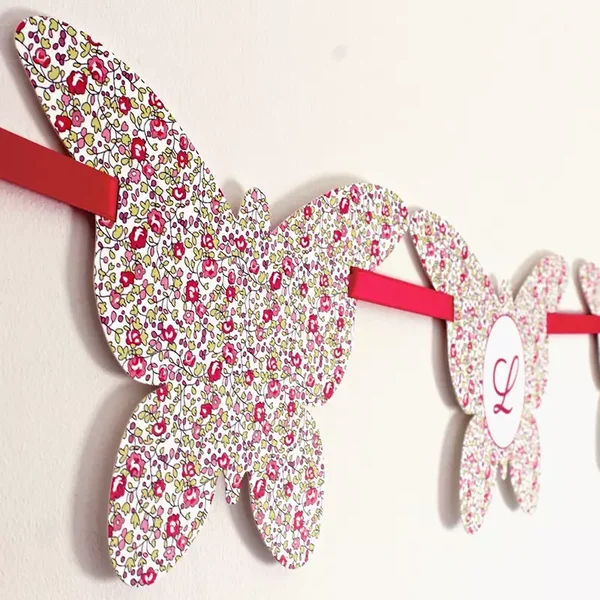 Guirlande de fanions de forme papillon imprimés au motif liberty de votre choix. Le prénom est encadré par un fanion tout en liberty et situé à chaque extrémité de la guirlande. La guirlande, livrée montée avec son ruban de satin, est prête à accrocher et à sublimer votre pièce ou votre sweet table.